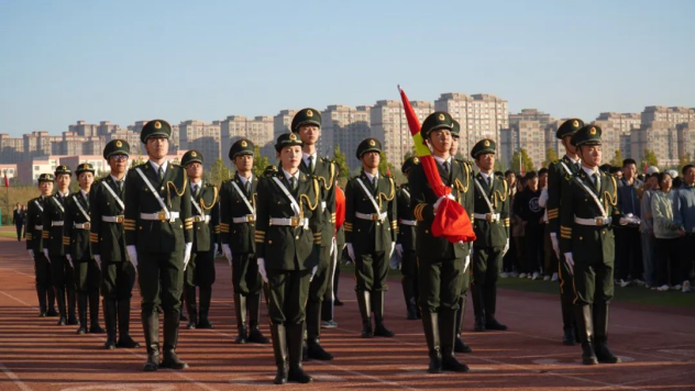 晨光中,国旗仪仗队迈着铿锵有力的步伐走向升旗台,在激昂的国歌声中升起鲜艳的五星红旗。师生们高唱国歌、庄严肃立,向冉冉升起的五星红旗行注目礼,向国旗、向伟大祖国致敬。