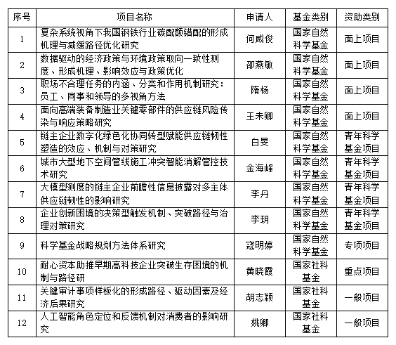 近日,国家自然科学基金委员会和全国哲学社会科学工作办公室分别公布了2025年度国家自然科学基金和国家社科基金集中申报评审结果。学院获批合计12项。其中,国家自然科学基金获批9项,包含面上项目4项、青年科学基金4项和专项项目1项,直接经费合计312万元;国家社科基金获批3项,包含重点项目1项和一般项目2项,经费合计75万元。具体立项情况如下: